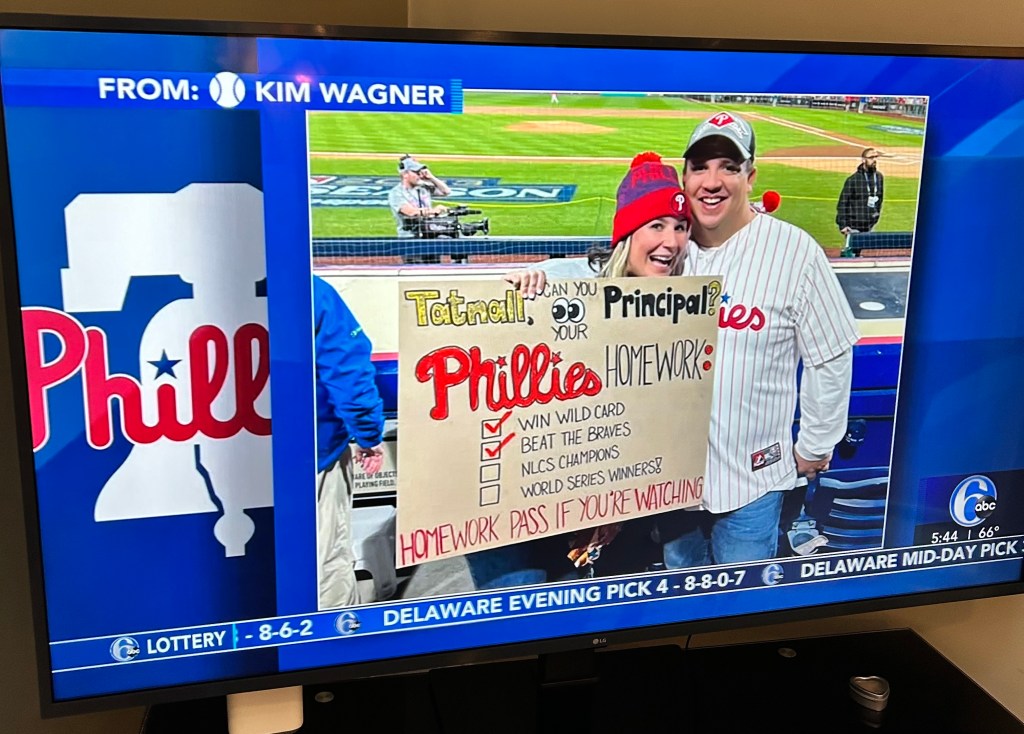 When I had my sign at the Phillies game, people stopped me to take pictures. They went to Tatnall; they knew someone who went to Tatnall, or they lived near Tatnall. We instantly became a small Tatnall/Phillies fan community, and it felt good. We smiled. We hugged. We yelled Go Phil’s as we parted ways.